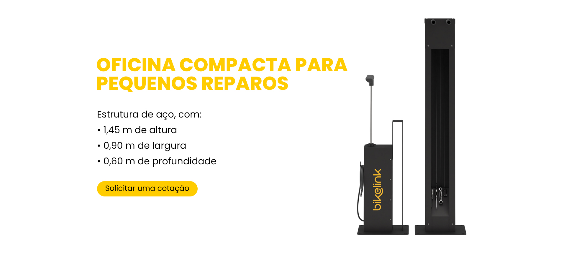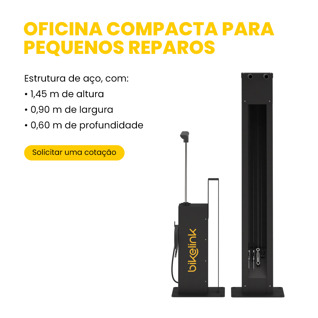 Estrutura de aço composta por 1 bomba de encher pneu com mangueira e válvula intercambiável,kit de ferramentas fixas em cabos de aço e suportes para apoio da bicicleta. Resistente à intempéries. Instalação simples e rápida diretamente no piso. Pode ser vendido separado (kit bomba ou kit torre com ferramentas).